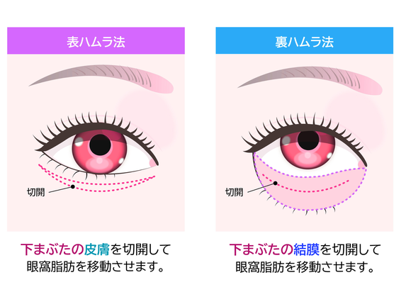 皮膚に傷跡が残らず、目の下の膨らみやクマを改善し、若々しい目元を目指すことができます。皮膚のたるみやしわが強い場合は、脂肪移動術(ハムラ法)や皮膚切開が必要になることがあります。