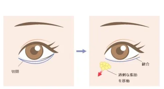 下まつ毛のすぐ下の皮膚を切開し、眼窩脂肪を移動させ、必要に応じて余分な皮膚を切除します。