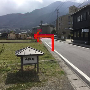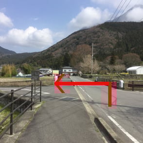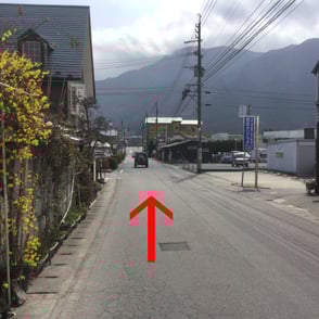 ①由布岳を目の前にして、「駅前・由布見通り」をまっすぐ進みます。