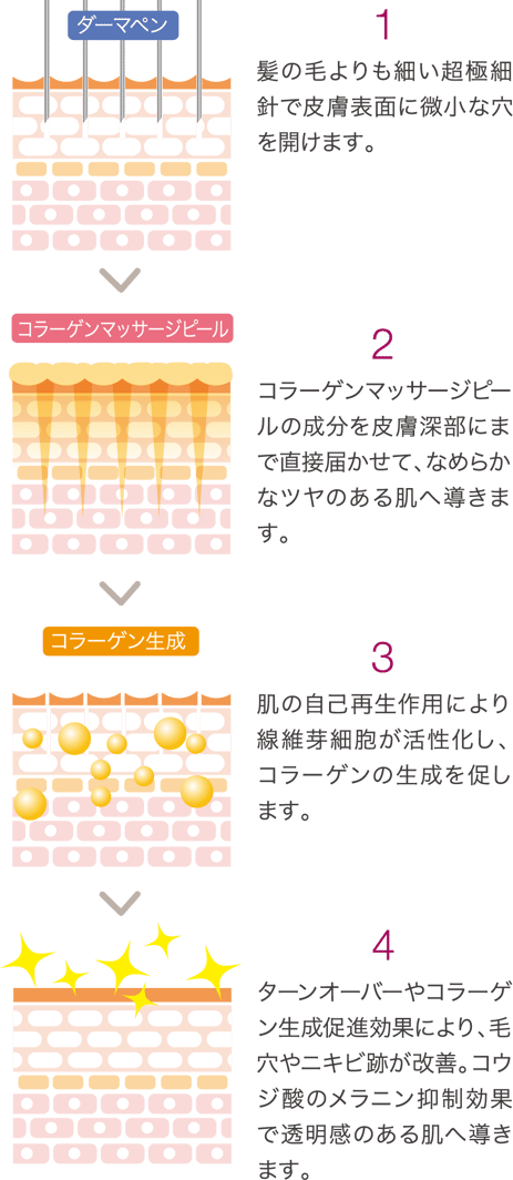 【ダーマペン】の16本の極細針がそれぞれ1秒間に120回もの微細振動で素早く1920個もの小さな穴を皮膚に開け、直後に【マッサージピール】を施術することにより「真皮層へ有効成分を届ける力」と「皮膚修復作用による大量のコラーゲン生成力」の相乗効果で美肌・美白・小じわ改善・コラーゲン産生によるたるみ引き締め効果を発揮します。