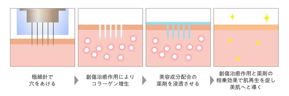 肌表面に微小な穴を開けることで、肌の自然治癒力を促し、肌質を改善してニキビ跡やクレーター、小じわ、毛穴の開きといった肌トラブルの改善や、エイジングケア効果が期待できます。